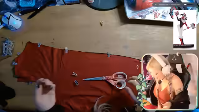 00:02:33Der Fokus wechselt zur Planung eines neuen Cosplays. Es handelt sich um ein Harley Quinn Outfit aus zwei verschiedenen Stoffen, die zusammengenäht werden sollen. Der Streamer diskutiert die Materialeigenschaften, insbesondere den Stretch des Stoffes, und wie man damit arbeiten kann. Die genaue Form des Outfits wird skizziert und der Stoff auf der Schneiderpuppe zur Anprobe vorbereitet.