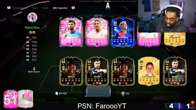 01:40:42Der Streamer berichtet von technischen Problemen mit FIFA, insbesondere dass Dani Olmo immer noch im Verein vorhanden ist, obwohl er ihn bereits ausgewählt hat. Es werden 3x14er Packs geöffnet, die aber für Freitag aufgespart werden. Der Streamer macht Olmo rot, um ihn für eine SBC zu verwenden. Der Streamer erklärt, dass er morgen früh live sein wird, da er normalerweise mittwochs streamt, aber er möchte mit seiner Familie Fastenbrechen. Er tauscht den heutigen Stream mit dem morgigen Stream. Der Streamer spricht über seine Ernährung und sein Gym-Training, das er seit Beginn des Ramadan wieder regelmäßig betreibt. Er geht meistens alleine ins Gym, um sich besser konzentrieren zu können und Gespräche zu vermeiden.