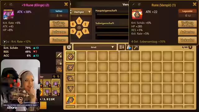 03:45:31Im Stream wurden Rune-Empfehlungen für den Anfang von Summoner's War besprochen. Hierbei wurde empfohlen, sich am Anfang auf Runesets zu konzentrieren, die zum eigenen Spielstil passen. Besonders das Vampir-Runen wurde für die blaue Lapis-Monster empfohlen, da es sowohl Schaden macht als auch gleichzeitig heilt. Es wurde betont, dass man immer auf den Stats achten sollte und nur Runen mit nützlichen Attributen wie Angriffskraft, Crit-Damage oder Crit Rate verwendet.