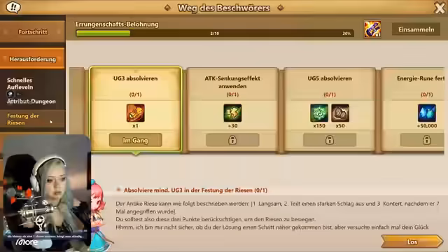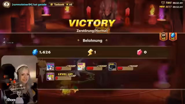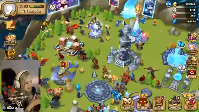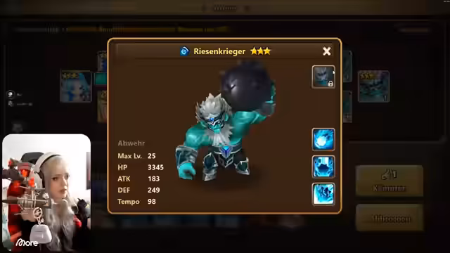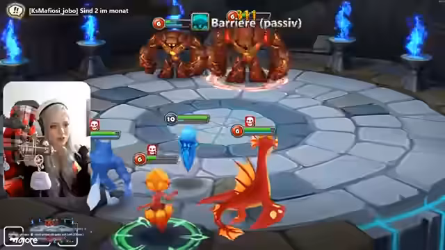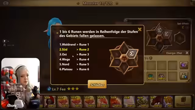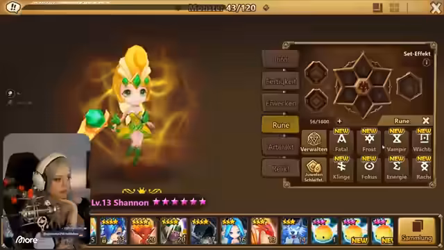 03:11:25Die Streamer kämpft in der Arena gegen andere Spieler, um ihre Monster zu stärken und Punkte zu sammeln. Sie gewinnen einen Kampf gegen einen Gegner mit Runen durch strategische Monsterwahl. Danach wird erklärt, wie Runen funktionieren und wie man sie ausstattet, besonders für die Feenkönigin, die ein Tempo-Set benötigt, um schneller zu sein und vor den Damage-Dealern agieren zu können. Es wird betont, dass man am Anfang mit grauen Runen auskommt, da sie später ersetzt werden.