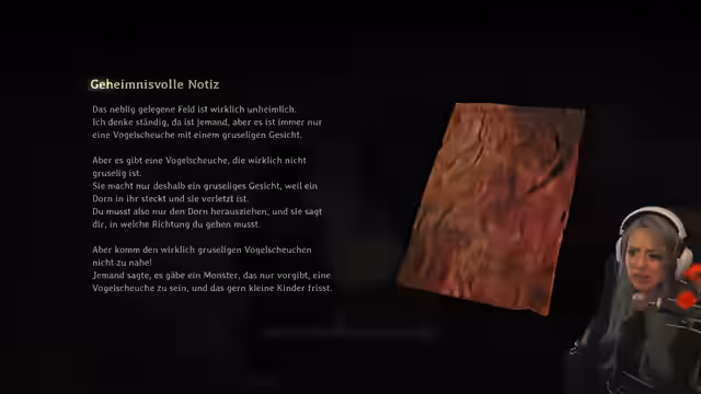 04:34:53Durch das Aufheben von Notizen und Gegenständen enthüllt der Streamer düstere Geschichten der fiktiven Stadt. Ein Autopsiebericht beschreibt einen seltsamen Mordfall, bei dem der Schädel eines Opfers von Insekten ausgehöhlt wurde. Ein Zettel deutet auf eine unausgesprochene Tragödie hin: Eine Frau, die unter der Gewalt ihres Manners leidet und sich das Leben nimmt. Diese gefundenen Geschichten, kombiniert mit der morbiden Umgebung, vertiefen das unheimliche und depressive Flair des Spiels erheblich über einfache Grusel hinaus.