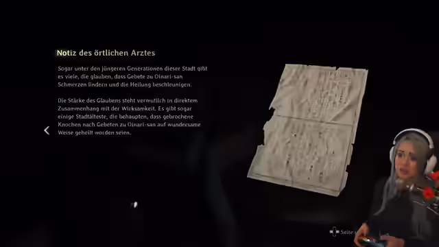 05:33:08Die Protagonistin findet einen Stellkammer-Schlüssel und eine Notiz, die auf verborgene Schätze im alten Lagerraum hinweist. Sie betritt den Lagerraum und findet eine Warnung, sich vom westlichen Zimmer fernzuhalten, sowie eine Fuchsmaske. Die Suche nach einem fehlenden Objekt gestaltet sich schwierig, da die Karte groß ist und viele Bereiche noch unerforscht sind. Sie findet eine Inari-Skulptur, die möglicherweise das gesuchte Objekt ist. Trotz der Warnung vor dem westlichen Zimmer betritt sie diesen, da sie keine andere Wahl hat, um voranzukommen. Sie findet eine verzierte Stangenwaffe, die ihre Kampffähigkeiten verbessert. In einem neuen Raum entdeckt sie einen Schrein und eine heilige Tür, die sie untersucht. Sie findet eine Notiz des Hausmädchens, die von einem Fluch berichtet, der auf der Familie lastet, sowie ein Protokoll des Hausarztes, das mysteriöse Symptome beschreibt. Die Protagonistin versucht, die Hinweise zu deuten und die Zusammenhänge zu verstehen, während sie weiterhin die Umgebung erkundet. Sie findet rote Kapseln und muss sich vor einem Monster in Acht nehmen. Die Atmosphäre des Spiels wird als unangenehm, aber fesselnd beschrieben.