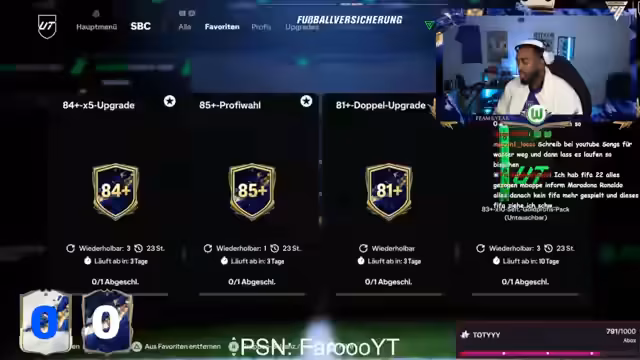 00:04:59Der Streamer wendet sich seinem FUT-Account zu und zeigt sich frustriert über die Spielleistung. Sein Account stehe angeblich bei 2-8, was er jedoch als Lügengeschichte der Community abtut. Er berichtet von Disconnects und kritisiert Mitspieler, die das Spiel ruinieren. Dabei fordert er die Gegner auf, Eigentore zu machen, da es aus seiner Sicht keinen Sinn mehr mache, das Spiel ernst zu nehmen.