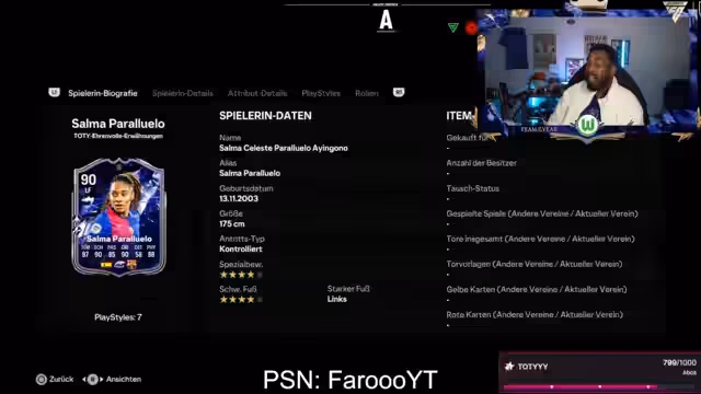 03:19:29Der Streamer beginnt mit der Durchführung und dem Test der Salma SBC. Er erstellt eine Chemie-3-Formation und testet die Karte intensiv im Spiel. Salma überzeugt durch ihre hohe Geschwindigkeit (97 Tempo), ihre Spielstärke und ihren linken Fuß. Der Streamer ist voll des Lobes und empfiehlt die SBC uneingeschränkt, solange man genug Futter besitzt.