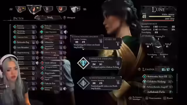 01:20:27Die Ausrüstung der Charaktere wird weiter optimiert, indem weniger nützliche Fähigkeiten wie 'hartnäckige Markierungen' gegen wertvollere Optionen wie 'läuternde Farbe' ausgetauscht werden. Letztere erhöht die Heilung bei Verbündeten. Die Analyse der verfügbarten Fertigkeiten zeigt, dass das System von 'Lumina' komplex ist, da manche mächtigen Fähigkeiten mehr davon kosten. Es wird strategisch entschieden, welche Passives für den aktuellen Kampf und zukünftige Herausforderungen am effektivsten sind.