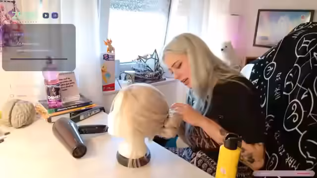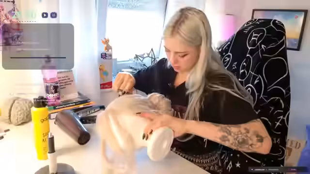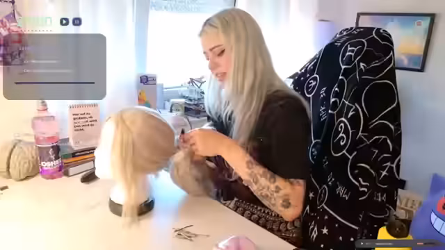 00:11:59Die Hauptaktivität des Streams ist das Styling einer Siri-Cosplay-Perücke aus Witcher. Der Streamer arbeitet daran, die Perücke zu kämmen und vorzubereiten, nachdem diese durch mehrfaches Tragen etwas gelockert war. Er erklärt die Besonderheiten von Kunstfaserhaaren im Vergleich zu echten Haaren und zeigt verschiedene Techniken, um die gewünschte Wellenform zu erreichen. Während dieser Zeit wartet er auf eine weitere Person, die an dem Styling-Prozess beteiligt sein soll.
