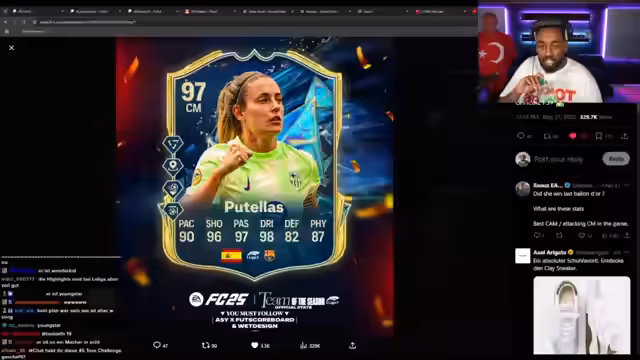04:17:09Der Streamer erlebt emotionale Höhepunkte während des Streams, darunter das Ziehen von Mbappé und anderen wertvollen Spielern. Er beschreibt die Gefühle als etwas, das man sich kaum vorstellen könne und dass das Spiel süchtig mache. Auch das Ziehen von Petri und anderen Tots-Spielern sorgt für große Freude. Gleichzeitig kritisiert er, dass manche Spieler wie Valverde sehr teuer sind und überlegt, ob er sie kaufen oder den Preis noch steigern lassen soll. Die allgemeine Stimmung ist geprägt von Aufregung und manchmal auch von Enttäuschung über die gezogenen Karten.