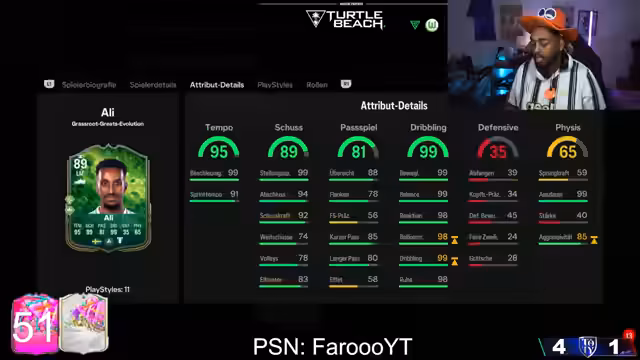 01:41:49Stream startet mit Diskussion über einen möglichen neuen Playstyle, der um 19 Uhr erscheinen könnte. Streamer zeigt eine neue Spielerkarte mit Evo-Potenzial, beeindruckenden Werten wie 99 Dribbling und 89 Schuss. Es wird über die optimale Position und Evolution der Karte diskutiert, mit der Frage, ob sie als Stürmer oder auf den Flügeln eingesetzt werden sollte. Streamer ist gespannt auf die Evolution der Karte und testet verschiedene mögliche Aufstellungen.