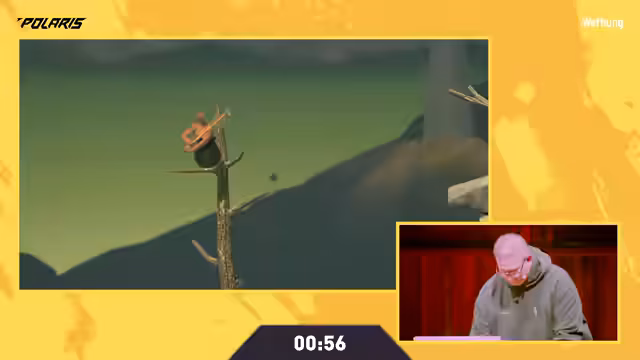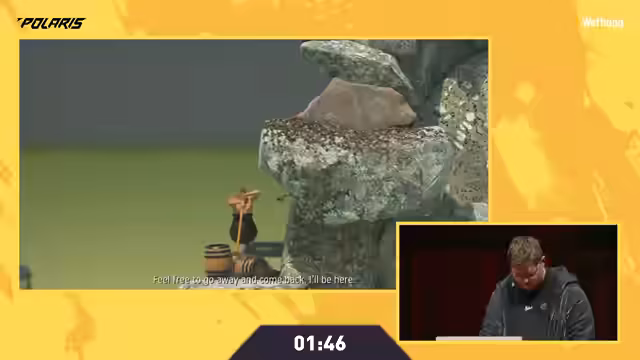 03:43:57Der Stream beginnt mit der ersten Disziplin, dem Spiel Getting Over It. Teilnehmer Sophie versucht, eine virtuelle Berglandschaft mit einem Hammer zu bewältigen. Kommentator und Publikum feuern sie an und analysieren ihre Techniken wie präzise Hammerplatzierung und kraftvolle Schwungbewegungen. Trotz starker Anstrengung und motivierender Rufe des Publikums gelingt es Sophie nicht, den Baum als Hindernis zu überwinden, was für Frustration sorgt. Der unbekannte Teilnehmer Olli startet das Spiel ebenfalls zum ersten Mal und zeigt anfängliche Fortschritte, scheitert aber ebenfalls am Baum. Paul, ein weiterer Teilnehmer, demonstriert seine eigenen früheren Schwierigkeiten mit dem Spiel. Am Ende der Runde gibt es eine Punktwertung: Gold und drei Punkte für Toki, der Titelverteidiger, Silber und zwei Punkte für Sophie und Bronze mit einem Punkt für Olli.
