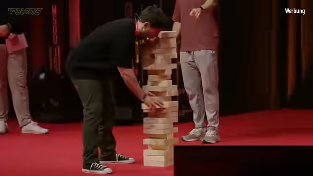 07:42:12Das Riesen-Jenga-Spiel erreicht seinen dramatischen Höhepunkt, als der Turm extrem instabil wird und kaum noch Steine sicher entfernt werden können. Nach einem riskanten Zug von einem der Spieler stürzt der gesamte Turm ein. Das Spiel endet nach einem neuen Rekord für die längste Runde und geht an eines der Teams.