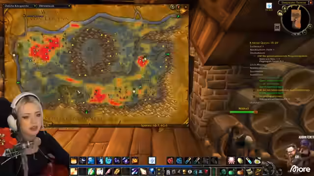 01:04:24Während des Spielens beschäftigt sich der Streamer intensiv mit den Spielmechaniken von World of Warcraft. Er farmt Ressourcen wie Lebenswurz und Königskraut, was gefährlich ist, da er sich oft in Gebieten mit höherstufigen Monstern bewegen muss. Er nutzt Spiel-Addons wie Nova World Buffs und sucht nach Gruppenmitgliedern, um Quests effizienter zu erledigen. Dabei kommt es zu technischen Problemen wie dem sogenannten 'Layern', bei dem Ressourcen despawnen, was ihn frustriert. Die Szene zeigt den Balanceakt zwischen Questen, Farmen und der Bewältigung der Spielumgebung.