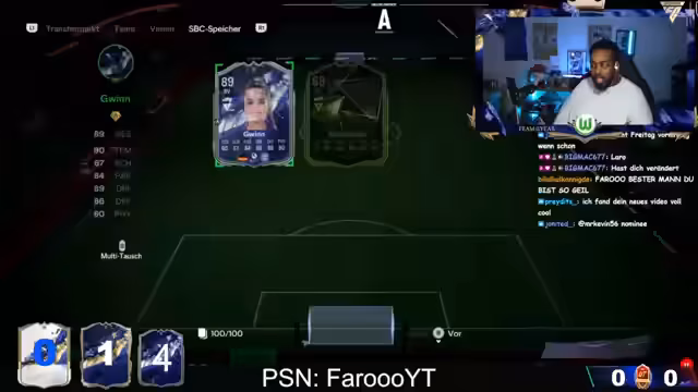 03:58:47Zunächst wurde die tägliche Anmeldung im Spiel durchgeführt, was traditionell zu einem Aufhängen des Spiels führt. Nach dem Neustart des Spiels wurden die neuen Inhalte überprüft, darunter die letzte Evolution zur Erstellung des Toti-Verteidigers. Es wurde festgestellt, dass man diese Evolution durch das Abschließen von Draftaufgaben erhalten kann, die auch offline absolviert werden können. Für 10 Siege in diesen Aufgaben erhält man Gjörg Ress Toti nomini gratis. Anschließend wurden die neuen SBCs (Squad Building Challenges) und Upgrades betrachtet, darunter 25 plus doppelt 3 mal 10 und Tokenpacks. Der neue Spieler des Tages wurde vorgestellt: Kane mit 97 Schusskraft und guten Plays, aber ohne Five-Star-Week-Foot. Der Streamer empfahl die Karte trotz des fehlenden Five-Star-Week-Foots. Im Shop wurde ein neues Pack mit einem garantierten Toti-Icon oder Toti-Nominee und 25 84 plus Spielern entdeckt. Der Streamer kündigte an, dieses Pack zu öffnen und hoffte auf ein Toti-Icon. Es wurde eine neue Evolution für ZMs vorgestellt, die 88 Tempo, 86 Physis und 88 Defense bietet, was sie ideal für Verteidiger oder ZMs macht. Abschließend wurde überlegt, ob man Gold De Jong in eine SBC einbauen soll.