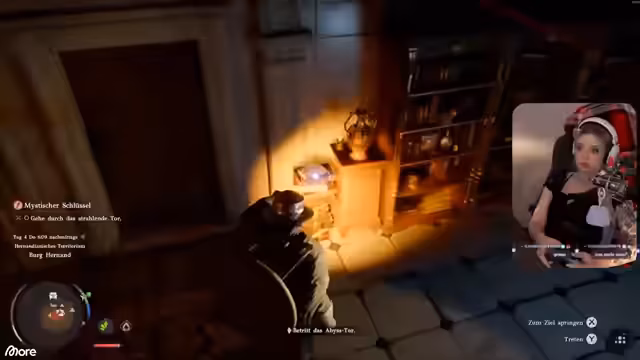 06:31:46Auf dem Weg zu seinem Questziel entdeckt der Streamer neue Interaktionsmöglichkeiten. Er findet einen Färber, bei dem er verschiedene Farben für seine Ausrüstung kaufen kann und eine neue Quest annimmt. Außerdem lernt er, dass man auf dem Pferd von einem Trab in einen Galopp wechseln muss, um mehr Geschwindigkeit zu gewinnen. Diese Feinheiten der Steuerung und die Entdeckung verborgener Orte steigern das Interesse am Spiel weiter.