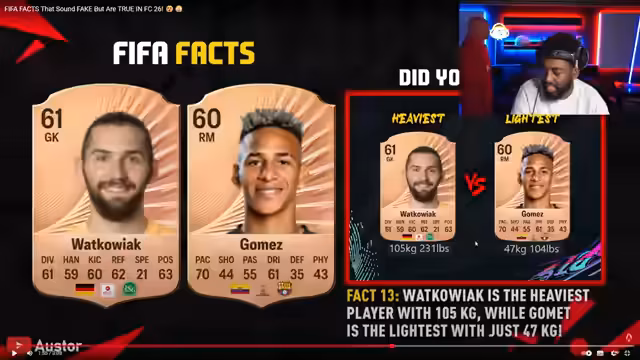 00:33:23Reaktion auf ein FIFA-Fakten-Video: Buffons Sohn spielt für Tschechien (kein Italiener mehr), Zidanes Sohn hat Algerien als Nation, Süle kann auf RM. Edgar Davids erhält eine Shapeshifter-Karte als Stürmer. Diskussion über überraschende Playstyle-Verteilungen bei Silberspielern und das Fehlen von Neymar/Mutu in FC26.