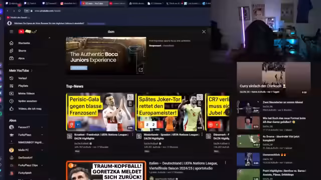 01:19:34Es wird diskutiert, ob Dänemark aufgrund von Highlights und Statistiken verdient gegen Portugal gewonnen hat. Der Streamer imitiert den Ronaldo-Jubel, was im Chat für Aufsehen sorgt. Brasilien und Kolumbien Highlights werden vermisst. Der Fokus liegt auf Toren statt langen Highlight-Zusammenfassungen. Ein strittiger Elfmeter für Kolumbien wird thematisiert, ebenso wie der überraschende Umstand, dass James Rodriguez trotz seiner Qualität bei Kolumbien von Rayo Vallecano aussortiert wurde. Ein Siegtreffer in der 98. Minute für Kolumbien wird hervorgehoben, wobei die Frage aufkommt, ob der Schuss haltbar war. Es folgen kurze Betrachtungen zu Spielen der Türkei, Ungarns sowie Deutschlands gegen Italien. Ein Tor der türkischen Nationalmannschaft wird besonders gelobt für die gute Vorbereitung und Ausführung. Ein weiteres Tor wird als Brustassist gefeiert. Der Streamer äußert Bedauern, ein bestimmtes Spiel verpasst zu haben, und bittet den Chat, ihn nicht mit Anfragen nach dem Irak-gegen-Kuwait-Spiel zu überfordern.
