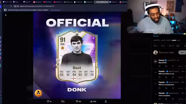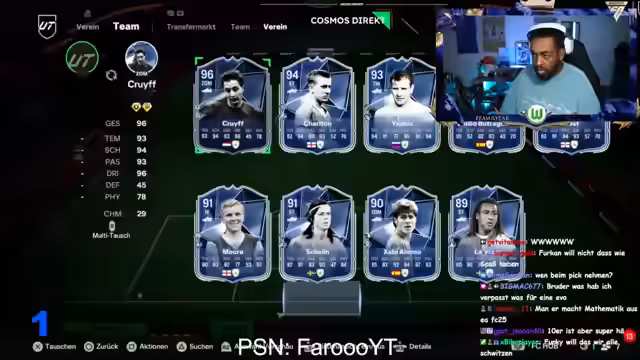 03:45:56Ein großer Teil des Streams ist der Eröffnung verschiedener Packs gewidmet. Der Streamer zieht regelmäßig Karten wie Scalvini, Forster und andere und äußert sich zu deren Stats und potenziellem Nutzen im Spiel. Gleichzeitig findet eine eingehende Marktanalyse statt. Es werden die Preise für Icons und Future Stars kritisch hinterfragt, wobei der Streamer die hohen Marktpreise für Karten wie Endrick als irrational und überteuert bezeichnet. Er analysiert die Wertentwicklung verschiedener Karten und gibt Tipps zur Marktstrategie, etwa mit dem Rat, abzuwarten und auf Preisdrops zu spekulieren.
