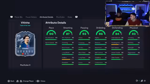03:10:56Die Bewertung setzt sich mit weiteren TOTY-Karten fort. Bonmarty wird mit 5-Sterne-Schwacher Fuß und Technik Gold besprochen, aber Quickstep Gold wird als unnötig im Mittelfeld eingestuft. Vittinia wird als der beste Zentrale midfielder im Spiel gelobt, mit Finesse Gold, 5-Sterne-Schwacher Fuß und exzellenten Stats wie 98 Vision und 96 Interceptions, obwohl der fehlende Pink Pass erwähnt wird. Puteyas wird als beste ZOM-Karte bewertet, mit Finesse Gold, Technical Gold und entscheidendem Pass, während Pedri trotz guter Stats (96 kurzer Pass, 95 Longshot) aufgrund fehlender defensiver Playstyles wie Intercept kritisiert wird. Der Streamer vergleicht die Karten, um die stärksten Optionen für verschiedene Positionen zu identifizieren, was das Kernthema des TOTY-Streams bildet.