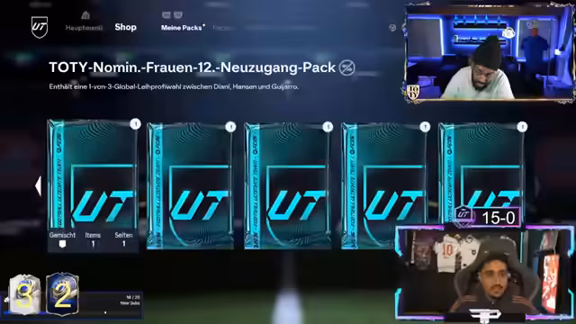 02:09:02Nach der Mittagspause werden neue Upgrades und Premium-Packs vorgestellt, darunter Premier League, La Liga und Frauen-Premium-Packs. Der Streamer zeigt Emotionen bei der Ankündigung der Verfügbarkeit und bespricht die Crafting-Möglichkeiten. Die Packs haben spezifische Spielerkombinationen, und es werden erste öffnungsversuche unternommen, um ein Team of the Year (TOTY) Mittelfeld zu bekommen.
