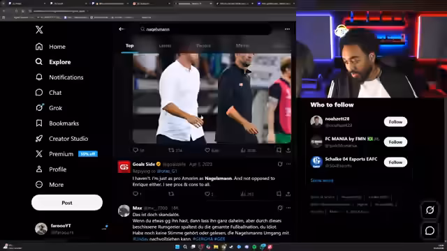 00:01:30Ein zentrales Thema ist der soeben veröffentlichte Stadion-Vlog, insbesondere die Begegnung mit Trainer Julian Nagelsmann. Der Streamer erzählt, dass er Nagelsmann im Parkhaus traf und ihn freundlich ansprach, um ein kurzes Interview für den Vlog zu machen. Die Situation eskalierte jedoch, als ein betrunkener Fan dazukam und Nagelsmann belästigte, wodurch der Streamer aus Sorge um dessen Sicherheit eingriff. Vorher hatte es einen normalen Smalltalk gegeben. Viele Medien und Fußballseiten haben das Video bereits aufgegriffen und geteilt, was zu hoher Aufmerksamkeit führte.