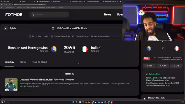 02:21:29Zu Beginn des Streams stehen die Kader der Nationalmannschaften im Fokus. Der Kommentator äußert sich beeindruckt von der starken Bank von Italien und Bosnien, die er als sehr gut besetzt ansieht. Es folgen taktische Analysen zu den anstehenden Spielen wie Dänemark gegen Tschechien und Schweden gegen Polen. Insbesondere bei der Türkei gegen Kosovo lobt er die Aufstellung von Ozan Kabak, die er selbst vorher als Notwendigkeit erkannt und prognostiziert hatte. Des Weiteren kritisiert er die Leistung eines Spielers scharf, der als ohne Playstyles und unfähig beschrieben wird.
