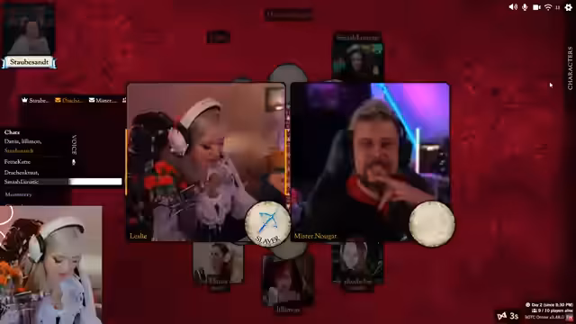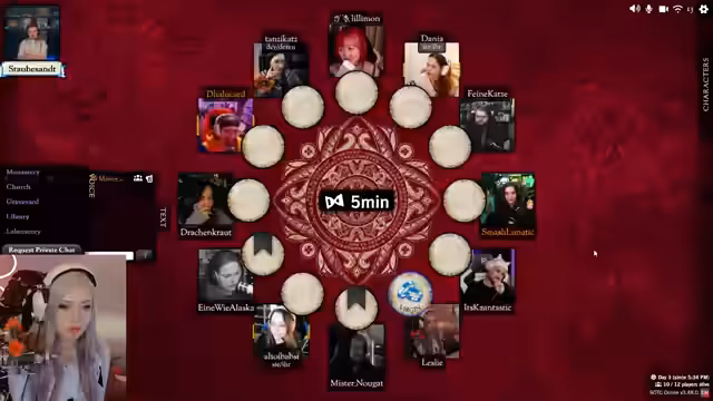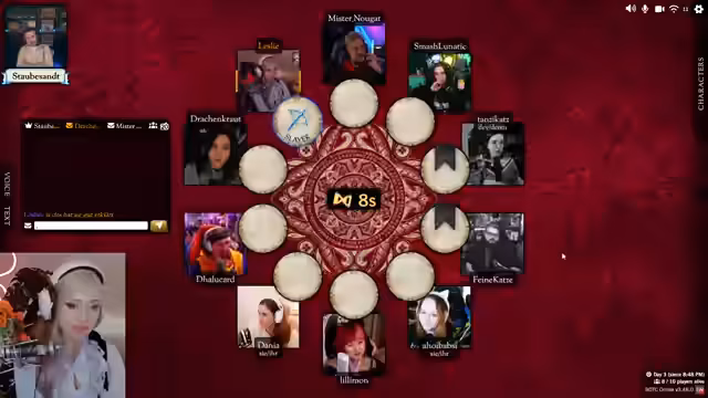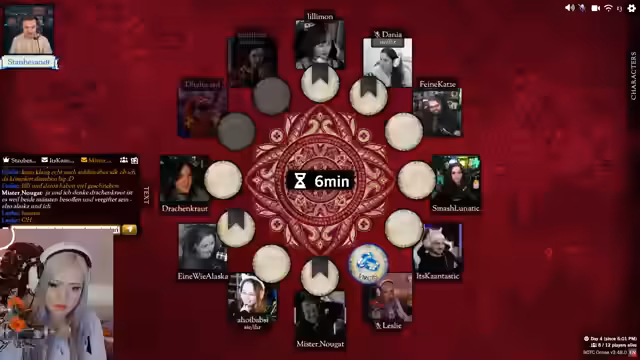 05:23:52Nach der ersten Nacht beginnt der Tag, und die Spielleitung gibt fünf Minuten für private Gespräche frei. Sofort fällt auf, dass 'Dahl' und 'Katze' erneut miteinander sprechen, was bei den anderen Spielern Misstrauen weckt. Ein Spieler fragt 'Dalu', warum er 'sass' sei, was dieser als 'Trollmodus' abtut. 'Lesti' berichtet, dass sie in der Nacht nichts gemacht hat, außer mit 'Mr. Nougat' und 'Dalu' zu reden und Schokolade zu essen. Es wird spekuliert, ob 'Lesti' die Rolle hat, die 'Dalu' in der letzten Runde gerne gehabt hätte, was zu der Annahme führt, dass sie befreundet sein könnten. Die Spieler tauschen sich über Codewörter aus, die in der Nacht übermittelt wurden, aber nicht immer ankamen oder falsch verstanden wurden. 'Lilly' äußert sich zufrieden mit ihrer Rolle, die ihrer Meinung nach eher am Ende des Spiels stärker wird. Die Spieler versuchen, kluge Strategien zu entwickeln, um länger zu überleben und ihre Rollen optimal zu nutzen. Die Verwirrung und das Rätselraten über die Rollen der anderen Spieler prägen die Atmosphäre.