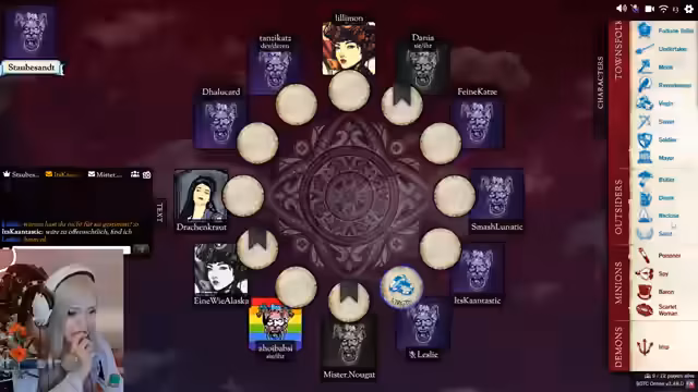 04:04:27Die Runde wird als sehr verwirrend empfunden, insbesondere für eine erste Runde. Spieler wie Babsi und Franzi werden aufgefordert, ihre Rollen zu offenbaren, um Klarheit zu schaffen. Es gibt Spekulationen über die Identität des Imposters und die Zugehörigkeit der Spieler zu Teams. Tanzi klagt Drachenkraut an, da sie glaubt, dass Drachenkraut versucht, einen Komplizen zu schützen, und vermutet, dass der Imp auf Drachenkraut übergegangen ist. Drachenkraut verteidigt sich, indem sie ihre Rolle als Waschweib offenbart und die Möglichkeit eines Trunkenbolds im Spiel anspricht, der zu falschen Informationen führen könnte. Die Diskussion dreht sich weiterhin um die Glaubwürdigkeit der Rollen und die Möglichkeit, dass Spieler betrunken oder vergiftet sind, was die erhaltenen Informationen verfälschen könnte.