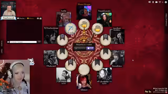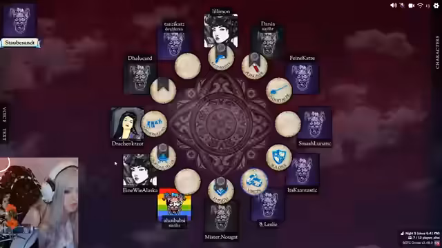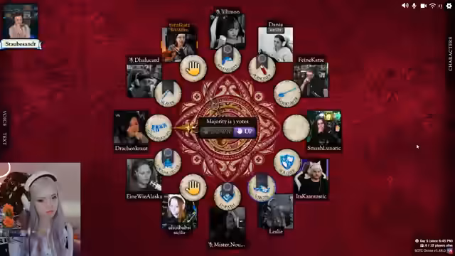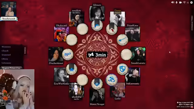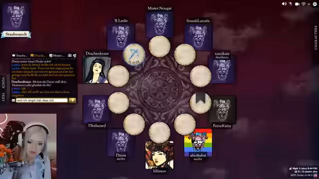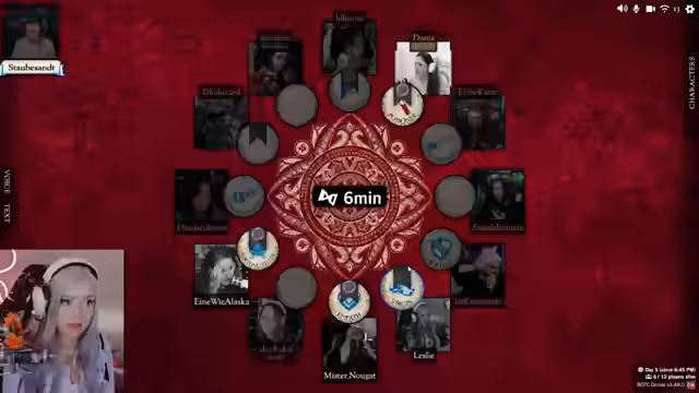 06:53:35Am Abend wird Babsi vom Dorf hingerichtet, was das Spiel in die nächste Nacht überführt. Kurz darauf wird ein weiterer Tod beklagt: Dalu-Kart ist in der Nacht gestorben. Das Spiel geht weiter, bis nur noch zwei Spieler leben und einer davon der Dämon ist. Die verbleibenden Spieler versuchen, die Zusammenhänge der Todesfälle zu verstehen und die Rollen der noch lebenden Personen zu klären. Leslie erinnert sich an eine Aussage über eine später wichtige Rolle im Spiel, die möglicherweise von Mr. Nougat oder Lilly stammen könnte. Die Rolle des Mönchs wird kritisch hinterfragt, da er bisher niemanden erfolgreich geschützt hat und seine Existenz als Mönch infrage gestellt wird. Die Möglichkeit, dass der Mönch vergiftet ist und somit seine Schutzfunktion nicht ausüben kann, wird ebenfalls erörtert. Die Diskussion konzentriert sich auf die Identifizierung des Dämons und die verbleibenden bösen Rollen, wobei jede Aussage und jede Handlung der Spieler genauestens analysiert wird, um die Wahrheit ans Licht zu bringen.