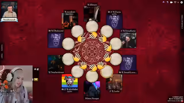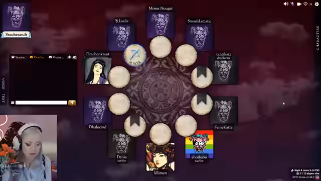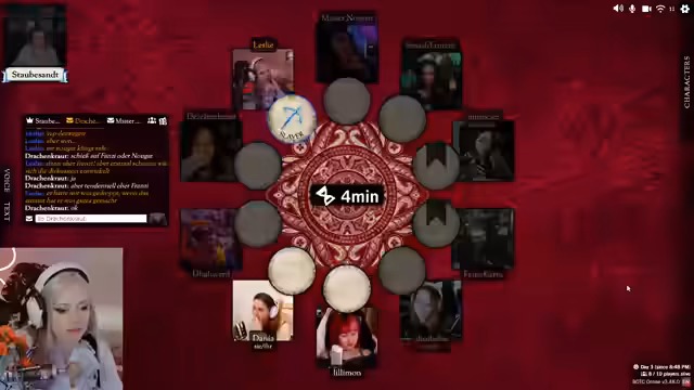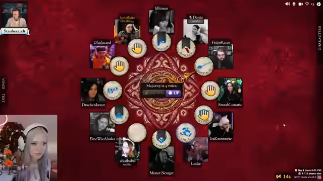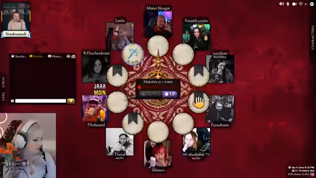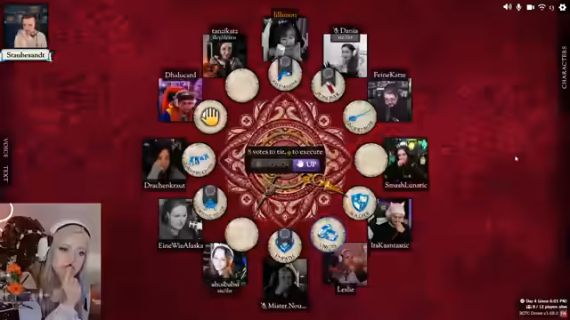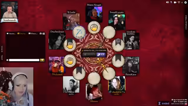 04:16:20Nach 60 Sekunden Zwischenfragen wird die Abstimmung gestartet. Tanzi klagt Drachenkraut an, basierend auf der Annahme, dass Drachi und Khan ein Team bilden und Khan der Giftmischer ist, während Drachi die Scharlachrote Frau sein könnte. Drachenkraut verteidigt sich, indem sie Tanzi beschuldigt, der Imp zu sein, der die Rolle übernommen hat, und vermutet, dass sie selbst der Trunkenbold ist. Die Spieler diskutieren intensiv über die Teamkonstellationen und die Auswirkungen der Abstimmungen. Es wird festgestellt, dass drei Stimmen für eine Nominierung benötigt werden. Die Abstimmung für Drachenkraut erreicht nicht die erforderliche Mehrheit. Daraufhin klagt Drachenkraut Tanzi an, was zu einer weiteren hitzigen Debatte über die Rollen und Loyalitäten führt. Die komplexen Verstrickungen und die Unsicherheit über die wahren Identitäten der Spieler machen die Entscheidungsfindung extrem schwierig.