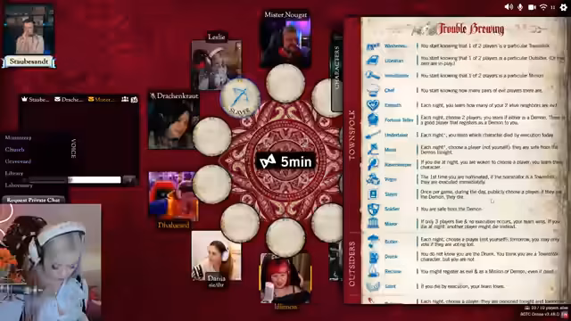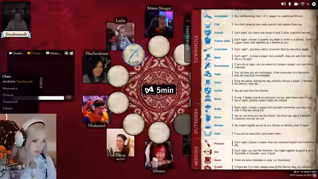 01:38:41Vor Beginn der ersten Nacht werden die Rollen verteilt und die Sitzplätze neu gemischt. Es wird darauf hingewiesen, dass Spoiler im Chat vermieden werden sollen, um den Spielspaß nicht zu beeinträchtigen. Nach der Rollenverteilung beginnt eine Phase, in der die Spieler ihre Rollen verstehen und erste Gespräche führen können. Es kommt zu ersten Spekulationen und Verdächtigungen unter den Spielern, insbesondere über die Identität des Dämons. Einige Spieler äußern sich zu ihren Rollen, während andere versuchen, ihre wahren Absichten zu verbergen. Die Chat-Funktion für Nachbarn wird rege genutzt, was zu amüsanten Interaktionen und ersten strategischen Überlegungen führt. Die Diskussionen drehen sich auch um die Möglichkeit, durch den Tod im Spiel weiterhin aktiv zu sein und Informationen zu sammeln, beispielsweise durch 'stille Post'.