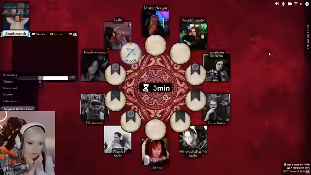 03:09:29Am nächsten Morgen stellt der Spielleiter den Tod von Lillimon fest. Die Spieler diskutieren über die möglichen Rollen der Verstorbenen und versuchen, durch Totengräber-Informationen mehr Klarheit zu schaffen. Es entstehen neue Theorien über die Identitäten der bösen Charaktere, wobei insbesondere Feine Katze im Zentrum der Verdächtigungen steht. Die Spieler sind sich uneinig, wer sie anklagen sollen, während einige wichtige Rollen wie der Heilige oder Butler noch nicht identifiziert sind.