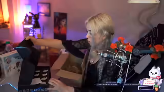 00:29:08Ein Paket von CD Projekt wird geöffnet, das unter anderem exklusive Cyberpunk- und Witcher-Merchandise wie eine signierte Maus, Tastatur und Mauspad enthält. Die Streamerin zeigt sich überwältigt von der Qualität und dem Umfang der Geschenke, die von Fabian Döhler (CD Projekt) gesendet wurden. Die Produkte werden detailliert präsentiert und teilweise für zukünftige Streams angekündigt.