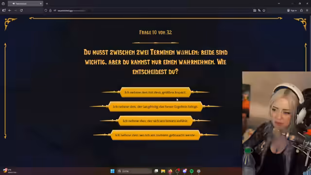 01:38:59Es werden Quizfragen zu Stressreaktionen und Priorisierung behandelt. Der Streamer beschreibt seinen persönlichen Umgang mit Druckphasen, pendelt zwischen Fokus und Vermeidungsverhalten. Bei Entscheidungen bevorzugt er langfristige Lösungen mit größtmöglichem Impact. Technische Probleme während Streams werden als größter Stressfaktor genannt, gefolgt von Respektlosigkeit im Chat.