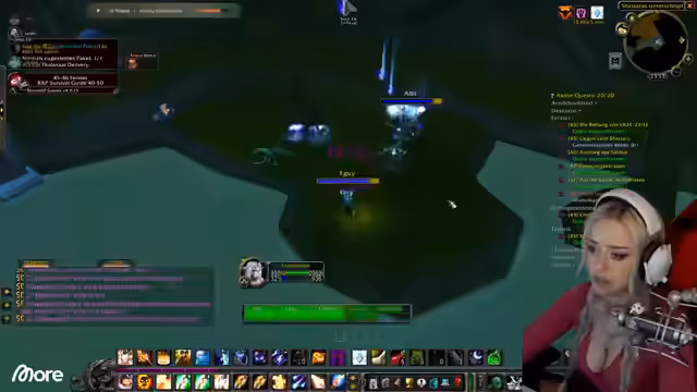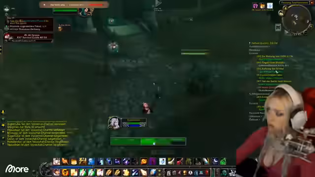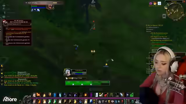 00:25:14Während der Quests stößt Sascha auf weitere Teammitglieder, die ebenfalls in Feralas unterwegs sind. Es kommt zu einer kurzfristigen Zusammenführung der Chats und der Stream verbindet die Communities. Der Streamer und Sascha interagieren mit den anderen Spielern, tauschen Buffs aus und schließen gemeinsam Quests ab. Die Stimmung ist entspannt, und es wird über die Zusammenarbeit und die unterschiedlichen Spielstiele gesprochen.