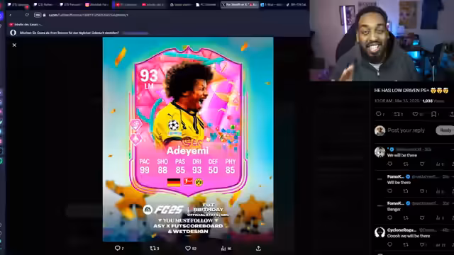 01:14:34Der Streamer erhält einen Link zu einer offiziellen Karte von Karim Adeyemi und ist begeistert. Er betont, dass Adeyemi der erste Spieler in der Geschichte von EA FC mit dem Low Driven Playstyle Plus ist. Er lobt die Werte der Karte, insbesondere das 99er Tempo und das 93er Dribbling, sowie die 5-Sterne-Skills. Er bezeichnet die Karte als "verkrackt" und schätzt den Preis auf über 1 Million Coins, falls Adeyemi der einzige Spieler mit Low Driven Plus im Team 2 ist. Der Streamer hört sich einen Beat des Künstlers an und vergleicht ihn mit anderen Künstlern. Abschließend bedankt er sich bei den Zuschauern für die Raid und beendet den Stream.