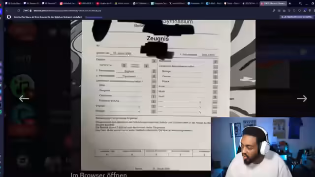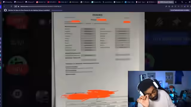 00:33:50Ein Zeugnis aus der Schweiz mit einem anderen Notensystem (1 ist die beste Note) führt zu anfänglicher Verwirrung und Ablehnung des 'hässlichen' Formats. Nach Aufklärung über das System werden die Noten jedoch als 'geiles' Zeugnis bewundert. Der Streamer reagiert begeistert auf die gute Durchschnittsnote und biete dem Nutzer humoristisch eine Anwaltstelle an, was die positive Resonanz unterstreicht.