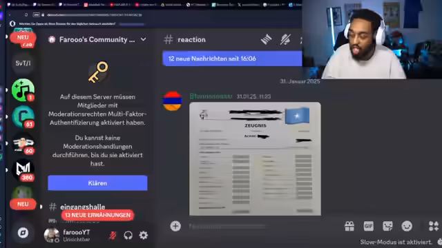 00:03:10Der Stream beginnt mit der Begrüßung der Community und dem Themenschwerpunkt 'Zeugnisse'. Der Streamer kündigt an, auf eingereichte Zeugnisse in seinem Discord zu reagieren, und erklärt den Prozess, einschließlich der Upload-Anforderungen und des Zeitraums für das Einsenden. Er betont die Bedeutung der Schule und der Bildung, selbst mit einem Augenzwinkern, und zeigt sich humorvoll, aber auch engagiert dem Thema gegenüber.