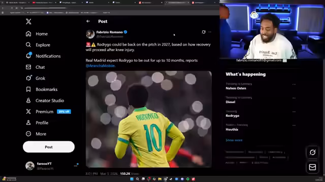 00:05:52Der Streamer widmet sich dem Thema Fußball und analysiert die anhaltenden Verletzungsprobleme bei Real Madrid. Er nennt eine Liste von verletzten Spielern, darunter Mbappé, Bellingham, Rodrigo und die gesamte Abwehr. Besonders kritisch sieht er die Situation im anstehenden Champions-League-Achtelfinale gegen Manchester City. Der Streamer bezweifelt, dass Real Madrid ohne seine Top-Spieler die Champions League gewinnen kann, prognostiziert ein frühes Aus und fordert, dass die Scouts für diese Fehlentscheidungen verantwortlich gemacht werden.