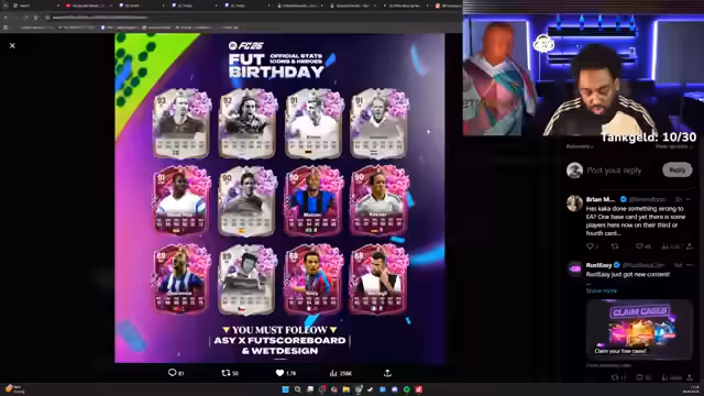 04:32:59Der Stream ist von anhaltender Frustration über FUT-Packs und das aktuelle FUT Birthday-Event geprägt. Der Streamer wiederholt seine Meinung, dass das Kaufen von Samaxima eine der schlimmsten Dinge sei, und er drückt seine Skepsis gegenüber teuren Packs aus. Er öffnet zahlreiche 525k-Packs und stellt fest, dass er ausschließlich totere Spieler und keine Full Birthday-Icons oder Heroes zieht, was er für unmöglich hält und als ragebait betrachtet.