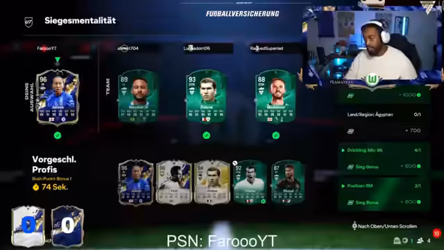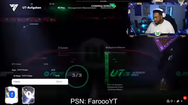 01:17:45Das Event beginnt, und der Streamer öffnet seine Packs, hat aber zunächst keinen Erfolg. Er zieht nur Silberspieler und Helden-Karten, was ihn extrem verärgert und deprimiert zeigt. Er fühlt sich von EA Sports 'geknackt' und ist überzeugt, dass sein Account 'redlisted' ist. Trotz der Öffnung von sehr vielen Packen und im Vergleich zu anderen Spielern bleibt sein TOTY-Count bei null, was seine Frustration steigert.