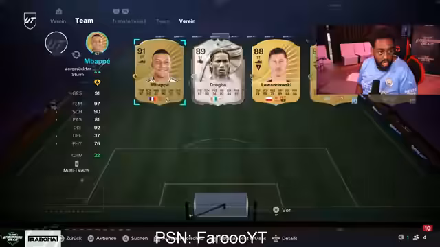 00:04:13Ein zentraler Bestandteil des Streams sind die zahlreichen Pack-Openings. Während viele Packs wertvolle Spieler wie Rotman und Bremer enthalten, ist das vielversprechende Thema des Doppel-Walkouts immer wieder präsent, wird aber selten realisiert. Spieler wie Tonalis und Lukaku wurden gezogen, ein Highlight war der Zug von Griezmann, dem ein Lupfer statt eines Finesse-Schusses gegeben wurde, was der Streamer als problematisch ansieht.