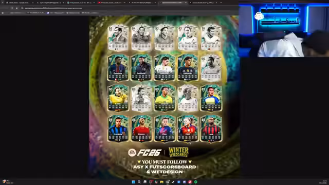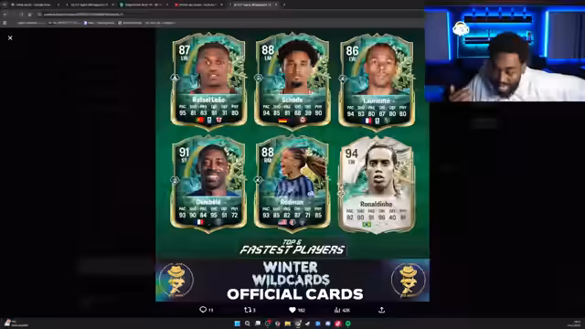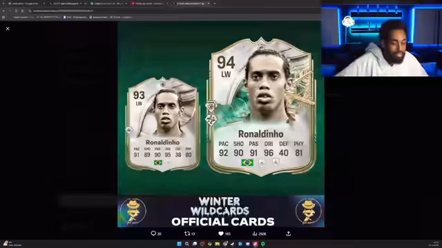 00:11:51Der Streamer beginnt mit der Ankündigung der Winter Wildcard-Promo und bezeichnet sie als krasseste Promo des Jahres, noch vor Black Friday. Er erwähnt offizielle Bestätigungen: Zur Interweight Card kommen zwei Playstyle Plus-Versionen, beginnend mit der Ronaldinho-Gaucho-Karte, die Technical und Finesse Playstyles erhält. Dies löst im Chat Panik aus, aber er betont, dass nur wenige Karten zwei Playstyles haben werden und die Promo trotzdem normal bleibt. Preisschätzungen für Ronaldinho liegen bei 15 Millionen Coins, was kaum erreichbar sein wird, während normale Karten nur einen Playstyle Plus erhalten.