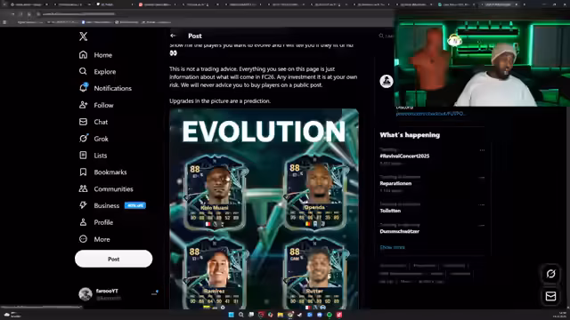 00:31:29Ein wichtiges Update wurde angekündigt: Spieler können nun bis zu drei Evolutions gleichzeitig abschließen. Besitzer der Ultimate Edition erhalten diesen Vorteil sofort, während andere Spieler am 19. Dezember nachziehen können. Dies ermöglicht flexibleres Team-Building und effizienteres Farmen von EVO-Spielern. Die Änderung wurde positiv aufgenommen, wobei der Streamer betonte, dass EA das System nicht überlasten sollte. Beispiele wie das Kombinieren mehrerer EVOs für Openda wurden als 'game-changing' hervorgehoben.