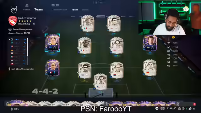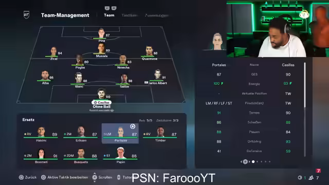 05:55:19Mit einem neuen Team bestehend aus Ronaldinho, Johann Cruyff und Claudia Pina startet Farooq die Weekend League. Er beschreibt seine Taktik mit vorgerückten Stürmern und Flügelspielern, ist jedoch nervös aufgrund möglicher Gegnerstärke. In den ersten Spielen überzeugt Cruyff mit 6 Toren und 6 Vorlagen in 5 Spielen, während Ronaldinho trotz guter Dribbling-Fähigkeiten Schwächen im Passspiel zeigt. Farooq gewinnt zunächst mehrere Spiele klar, verliert dann aber knapp gegen ein stark defensiv ausgerichtetes Team mit Spielern wie Bellingham und Schweinsteiger.
