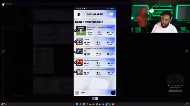 01:24:03Der Streamer kündigt an, auf die PlayStation Wrapped-Ergebnisse der Zuschauer zu reagieren, ähnlich wie Spotify Wrapped oder Twitch Recap. Der Link zur PlayStation-Website wird im Chat geteilt, und Zuschauer werden aufgefordert, Screenshots ihrer meistgespielten Spiele 2025 im Discord zu posten. Der Streamer erwartet hauptsächlich FIFA, ist aber auf Überraschungen gespannt.