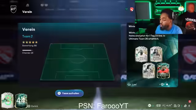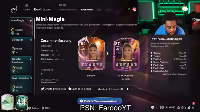 01:50:54Der Streamer checkt die täglichen Winter Wildcard-Belohnungen und zeigt Courtois als neues Top-Torwartkarte. Es folgt eine Diskussion über neue Evolutions, die Spieler wie Ademi oder Bahoya verbessern können, um Schuss-Playstyles zu erhalten. Besonders freut er sich auf Evolutions für seine Lieblingsspieler, die er mit Pass-Playstyles aufrüsten will. Kritik an EA, dass man viele Spiele spielen muss, um Evolutions abzuschließen.