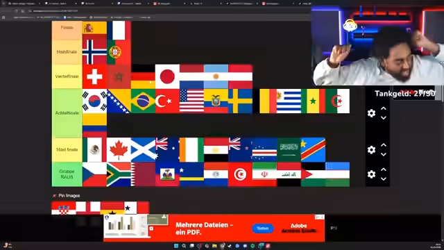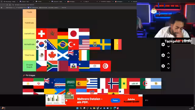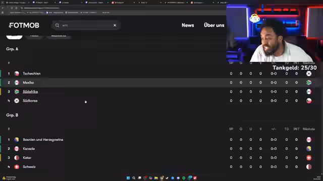 02:15:06Der Streamer beginnt mit der Durchführung der angekündigten WM-Tierlist. Zuerst analysiert er die Gruppenphase und gibt für jede Nation eine Prognose, wie weit sie kommen wird. Dies ist Teil eines größeren Vorhabens, eine vollständige Tabelle mit Siegern und Niederlagen für das Turnier zu erstellen. Er startet mit der ersten Gruppe und gibt beispielsweise Tschechien als sicheren Kandidaten für das Achtelfinale aus, sieht Mexiko jedoch mit Finalambitionen, falls sie zu Hause spielen.