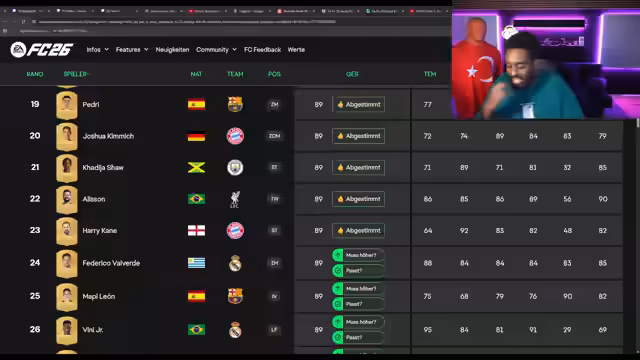 00:22:53Es wird auf die FC 26 Ratings eingegangen und die Möglichkeit, darüber abzustimmen, ob die Ratings fair sind. Es wird ein Leak über Winter Downgrades und Upgrades erwähnt, die möglicherweise zurückkehren. Der Streamer reagiert schockiert und begeistert auf die Information, dass es möglicherweise wieder Winter-Upgrades und Downgrades geben wird, wie in alten FIFA-Teilen. Dies bedeutet, dass Spieler, die gut performen, im Dezember ein Upgrade ihrer Goldkarte erhalten könnten. Als Beispiel wird genannt, dass ein Spieler wie Ronaldo, wenn er gut spielt und die Community ihn pusht, ein Upgrade auf beispielsweise 87 erhalten könnte und somit besser als Messi wäre. Der Streamer betont die Wichtigkeit des Votings, damit Spieler wie Ronaldo ein Upgrade erhalten. Der Link zum Voting wird in den Chat gepostet, damit alle teilnehmen können. Es wird diskutiert, welche Ratings für verschiedene Spieler passen oder angepasst werden sollten, wie Alexia Poteas, Mbappé, Dembélé und Rodri.