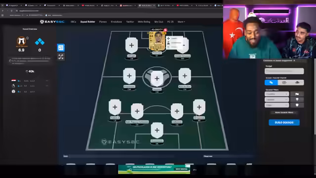 02:35:58Es wird zum nächsten Team für 500.000 Coins übergegangen, wobei der Chat um Vorschläge gebeten wird. Es werden Spieler wie Bakula und Paris genannt. Leo soll 100k kosten und Nico Williams ungefähr zu teuer sein. Es wird überlegt, Nico rechts und Leo links spielen zu lassen. Florente wird mit 50k als guter Call angesehen. Dijon wird als starke Karte hervorgehoben, aber als zu teuer eingestuft. Es wird ein Stürmer für 70k gesucht, wobei Rashford als Option genannt wird. Openda wird auf 40k geschätzt. Es wird ein Bild vom Team gemacht und die Community um Feedback gebeten. Es wird diskutiert, ob Openda und Turam gut sind und ob die Verteidigung passt. Abschließend wird gesagt, dass alles Schätzung ist, da man die Preise nicht zu 100 Prozent kennt.