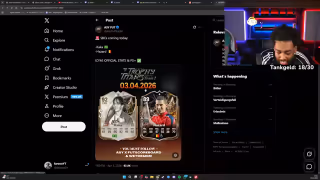02:09:30Ein wichtiges Ereignis ist die Ankündigung des neuen "Trophy Titans Team 1 Upgrade" SBC. Der Streamer bezeichnet dies im Grunde als ein "Icon Pack" und plant, einige Karten zu öffnen. Er zeigt große Begeisterung für die potenziellen Karten und stellt fest, dass solche Bilder die Spielerkarten für ihn noch attraktiver machen. Er hebt den jungen Hazard-K hervor, der Quick Step hat, und diskutiert dessen Evo-Potenzial. Allerdings zweifelt er am Wert und an den Kosten des SBC, insbesondere im Vergleich zu anderen Evos, und empfiehlt den Zuschauern, abzuwarten, bevor sie ihn abschließen.
