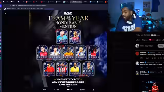 00:37:43Der Streamer stellt die neuen Team of the Year SPC-Karten vor, die heute erscheinen. Dazu gehören Billy, Foden und Kane. Er analysiert die Stats und Rollen der Karten und gibt eine Empfehlung ab. Während Billy und Foden als sehr safe und vielseitig eingestuft werden, wird Kane als reinen Stürmer betrachtet, der weniger flexibel einsetzbar ist. Der Streamer signalisiert, dass er Billy und Foden wahrscheinlich in sein Team aufnehmen wird.